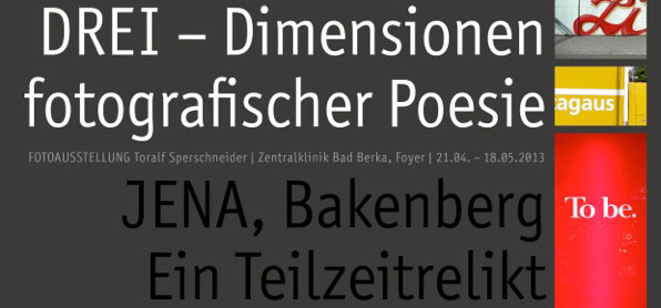 2013–2014 | Bad Berka (Zentralklinik) Meiningen (Inselgalerie) Fotoausstellungen »DR3I. Dimensionen fotografischer Poesie.« & »JENA. Bakenberg.« |
