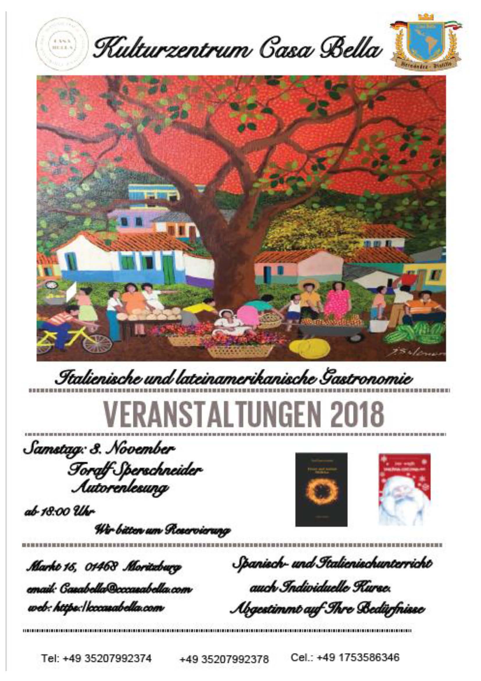 2018 | Jena (Poetry Slam, Multimedia Vorträge »Der weiße Weihnachtsmann«) Sonneberg (Lyrik mit musikalischer Begleitung) Moritzburg (Lyrik mit musikalischer Begleitung und Gesang; Multimedia Vortrag »Der weiße Weihnachtsmann«) |